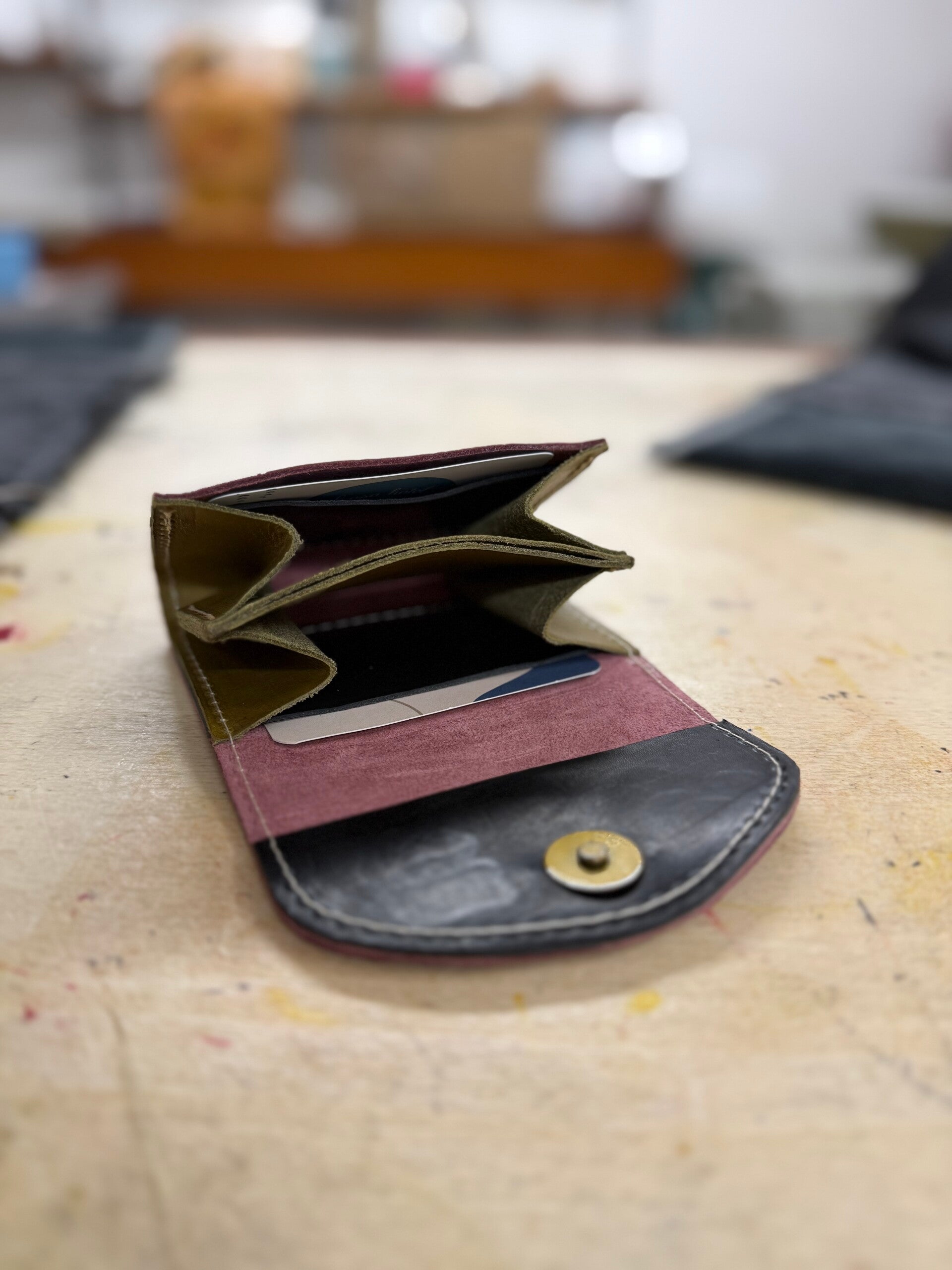 Portafoglio in pelle martellata conciata al vegetale di alta qualità, proveniente dalle concerie del Consorzio vera pelle conciata al vegetale in Toscana. Ogni pezzo è fatto a mano nel mio laboratorio, dove porto su pelle i colori e la forza della natura.