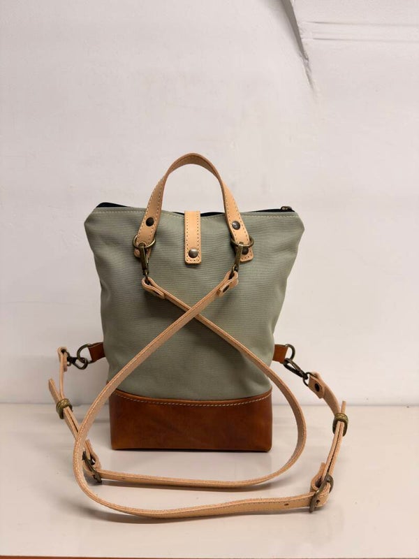 Dettagli naturali: Gli spallacci e le rifiniture sono in cuoio a concia naturale, che schiarisce il design e crea un contrasto sofisticato con il corpo dello zaino.
